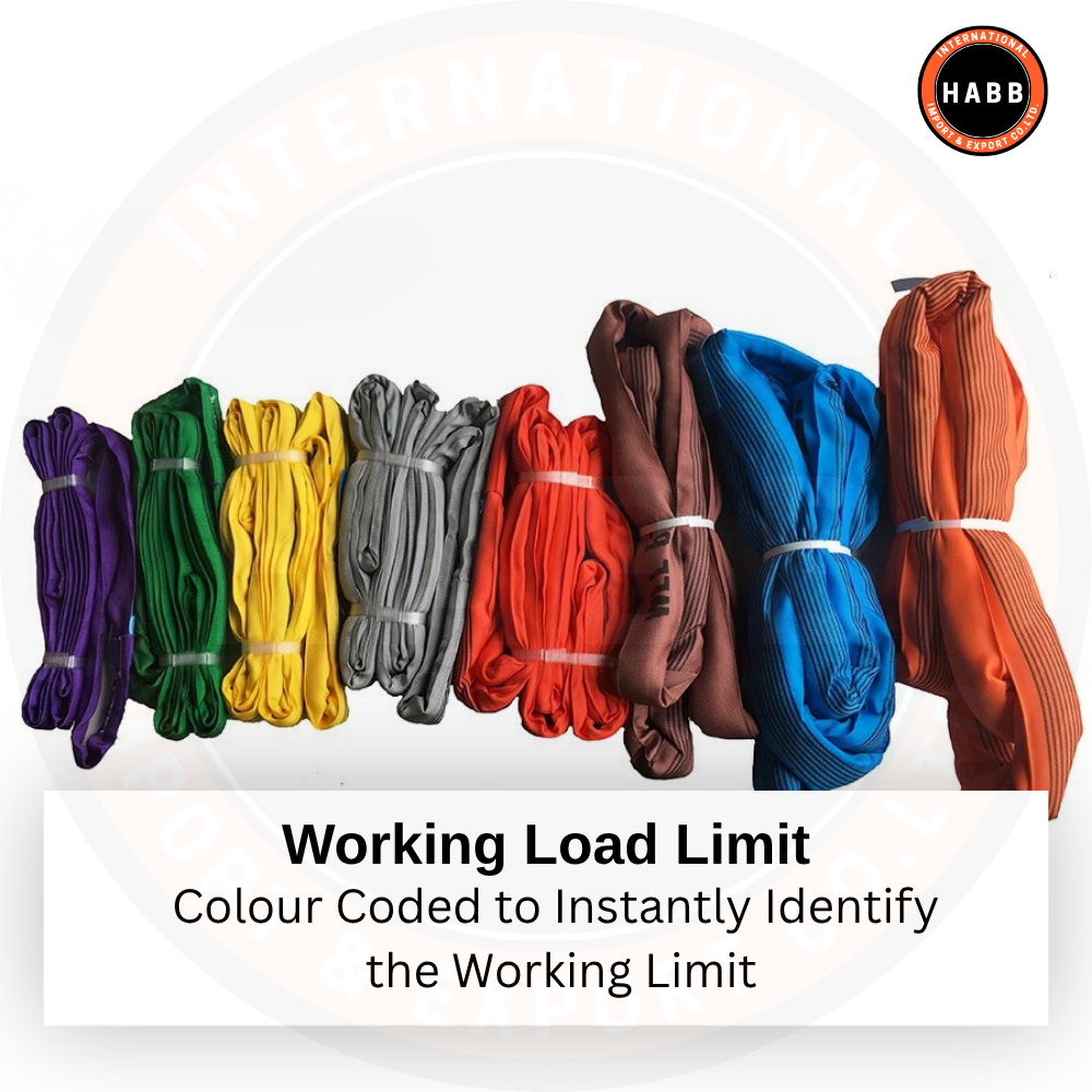 Key Feature: Seamless endless loop with protective sleeve. Black stripes on sleeve indicate capacity (each stripe = 1.000 kg). Blue permanent label with full traceability.